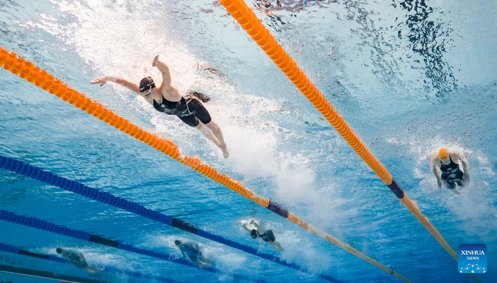 This file photo taken on July 31, 2025 shows Summer McIntosh (top) of Canada competing during the women's 200m butterfly final of swimming at the World Aquatics Championships in Singapore. (Xinhua/Xia Yifang)