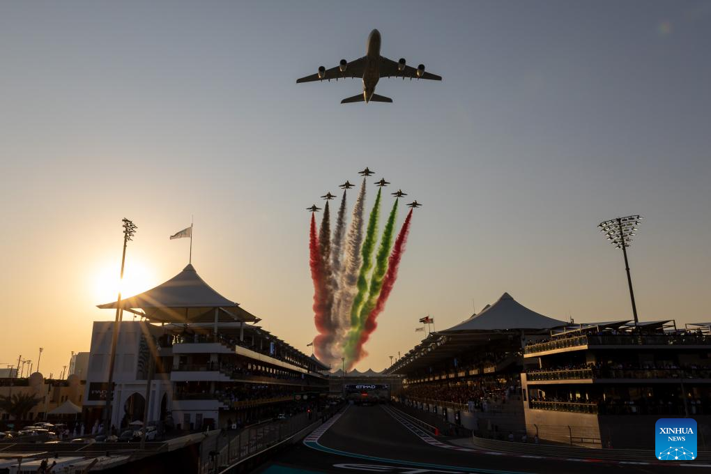 This file photo taken on Dec. 7, 2025 shows an Etihad aircraft accompanied by Emirates jets performing a flyover before the start of the Formula One Abu Dhabi Grand Prix at the Yas Marina Circuit in Abu Dhabi, the United Arab Emirates. (Photo by Li Chao/Xinhua)