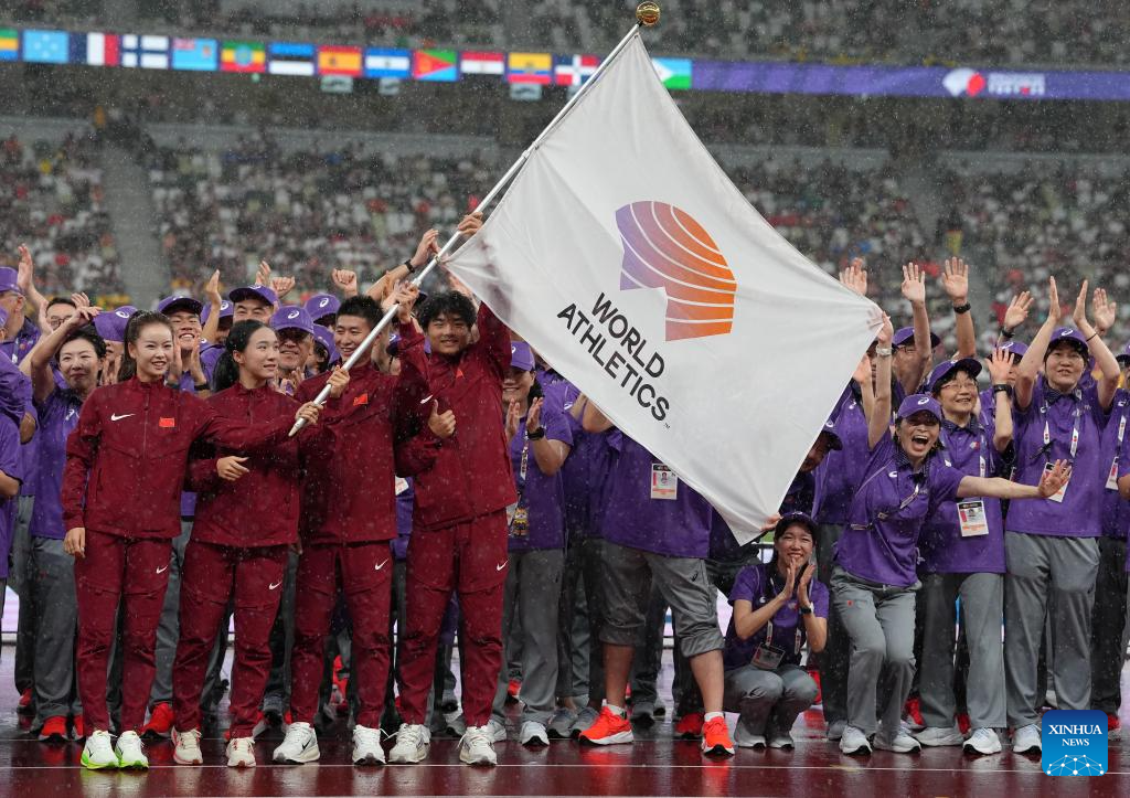 This file photo taken on Sept. 21, 2025 shows athletes of China waving a World Athletics flag during the Handover Ceremony of the World Athletics Championships in Tokyo, Japan. (Xinhua/Ju Huanzong)