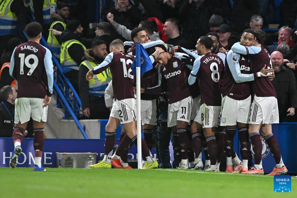 Ollie Watkins (No.11) of Aston Villa celebrates his goal with teammates during the English Premier League match between Chelsea and Aston Villa in London, Britain, Dec. 27, 2025. (Xinhua)