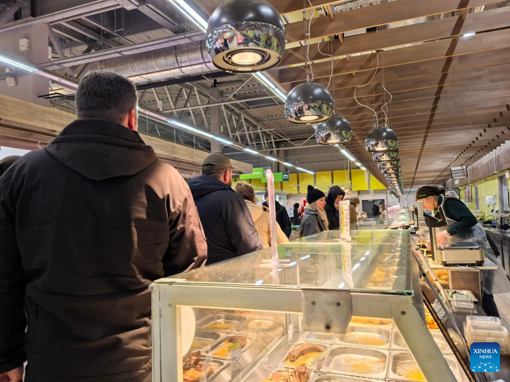 People wait in line to buy food at a supermarket in Kiev, capital of Ukraine, Dec. 27, 2025.