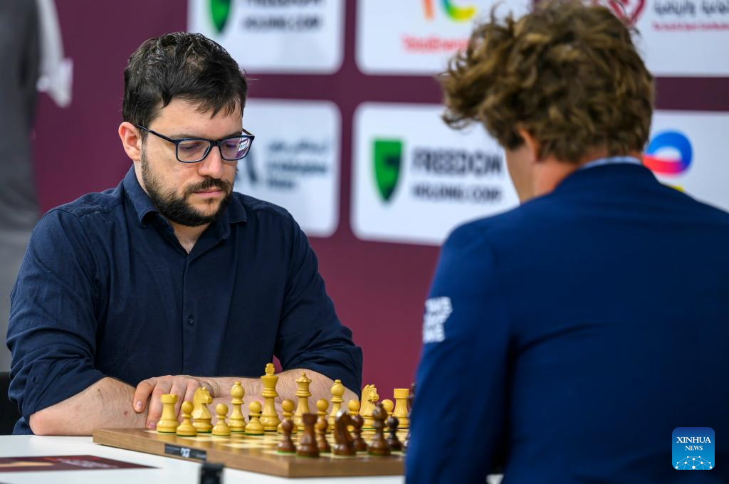 Maxime Vachier-Lagrave (L) of India competes during the Rapid Open sixth round against Magnus Carlsen of Norway at the FIDE World Rapid & Blitz Championships 2025 in Doha, Qatar, on Dec. 27, 2025. (Photo by Nikku/Xinhua)