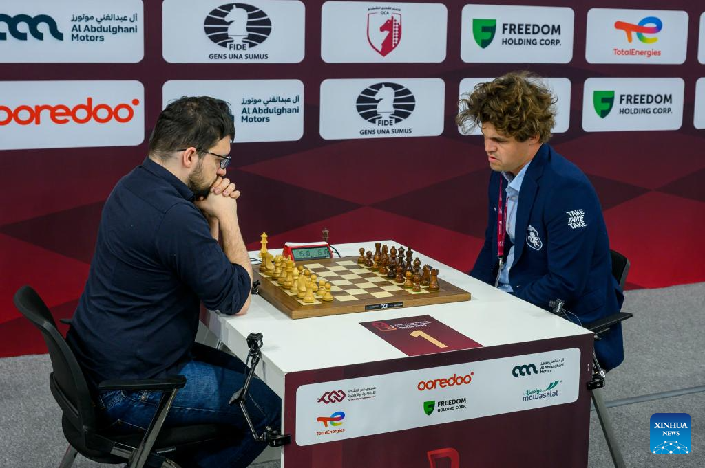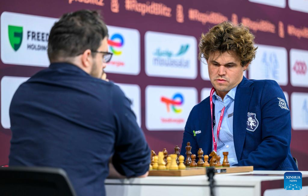 Magnus Carlsen (R) of Norway competes during the Rapid Open sixth round against Maxime Vachier-Lagrave of India at the FIDE World Rapid & Blitz Championships 2025 in Doha, Qatar, on Dec. 27, 2025. (Photo by Nikku/Xinhua)