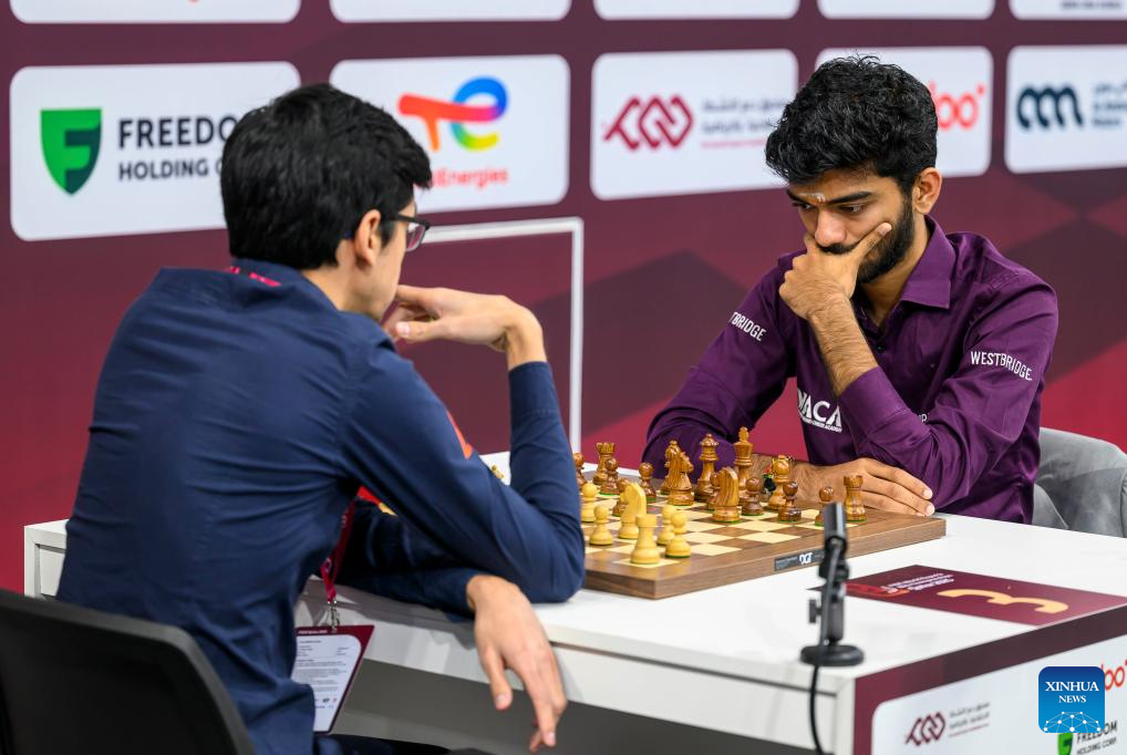Gukesh Dommaraju (R) of india competes during the Rapid Open sixth round against Anish Kumar Giri of Netherlands at the FIDE World Rapid & Blitz Championships 2025 in Doha, Qatar, on Dec. 27, 2025. (Photo by Nikku/Xinhua)