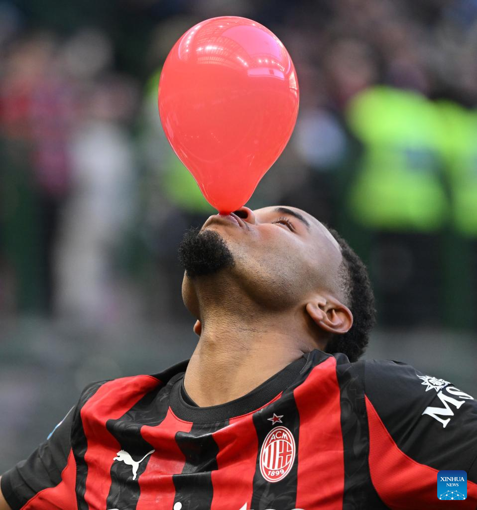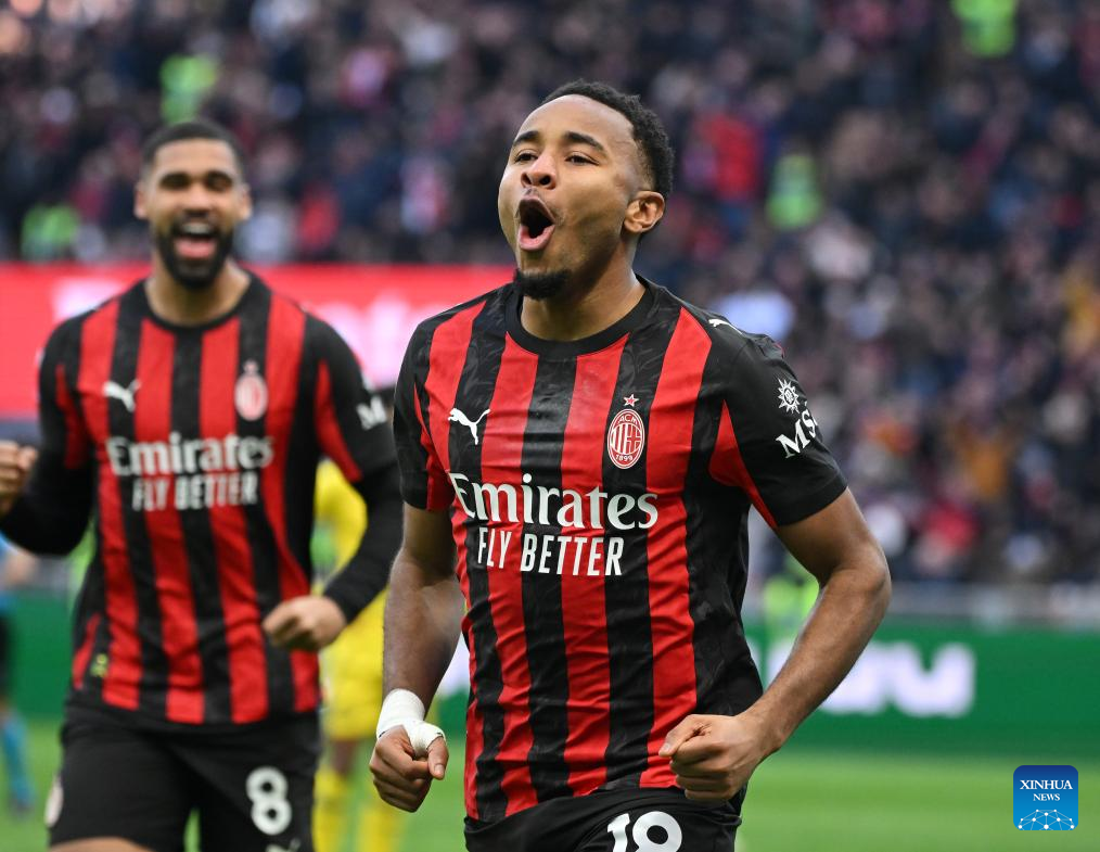 AC Milan's Christopher Nkunku celebrates his first goal during a Serie A football match between AC Milan and Hellas Verona in Milan, Italy, Dec. 28, 2025. (Photo by Alberto Lingria/Xinhua)