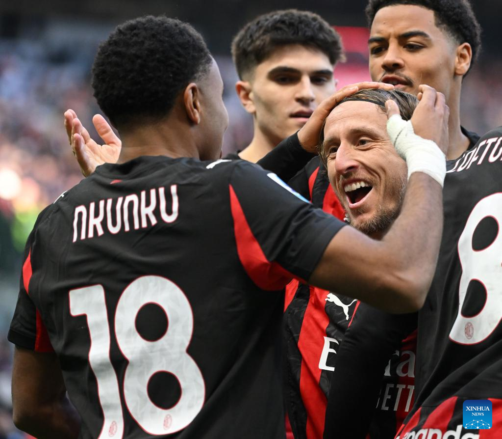AC Milan's Christopher Nkunku (front L) celebrates his second goal with his teammate Luka Modric (front R) during a Serie A football match between AC Milan and Hellas Verona in Milan, Italy, Dec. 28, 2025. (Photo by Alberto Lingria/Xinhua)
