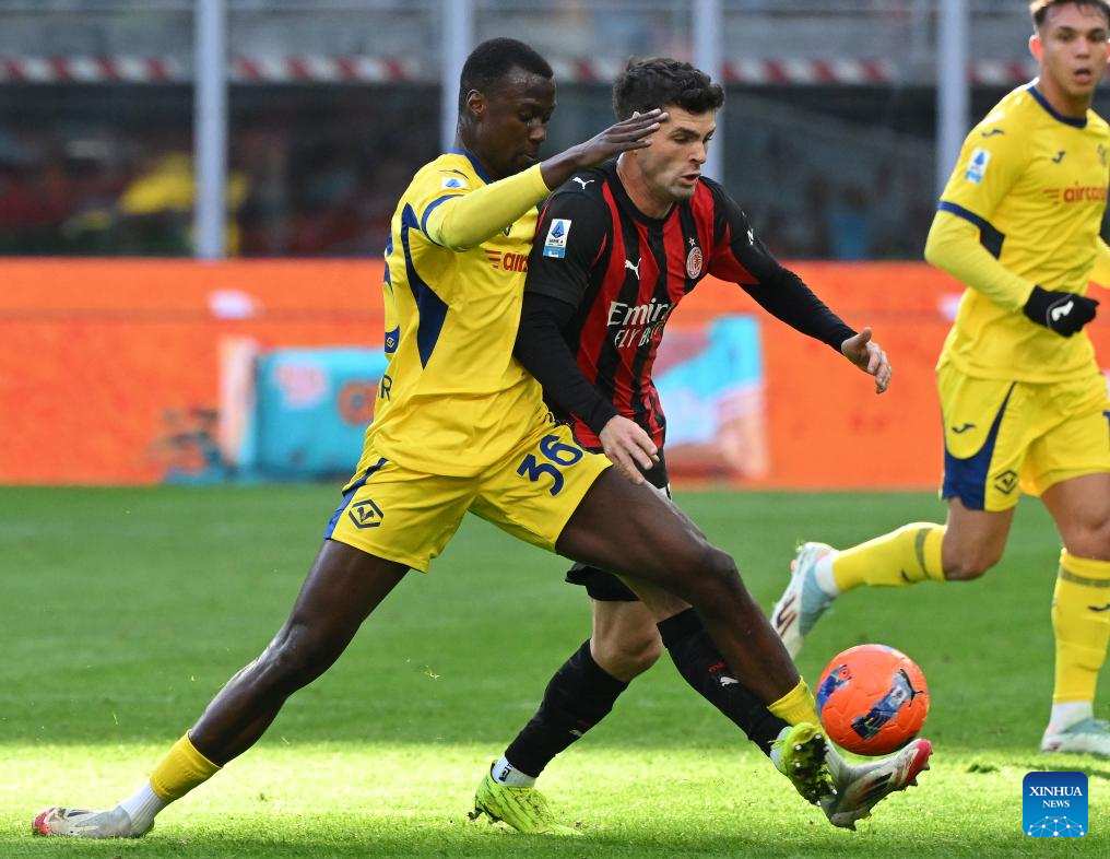 AC Milan's Christian Pulisic (C) vies with Hellas Verona's Cheikh Niasse (L) during a Serie A football match between AC Milan and Hellas Verona in Milan, Italy, Dec. 28, 2025. (Photo by Alberto Lingria/Xinhua)