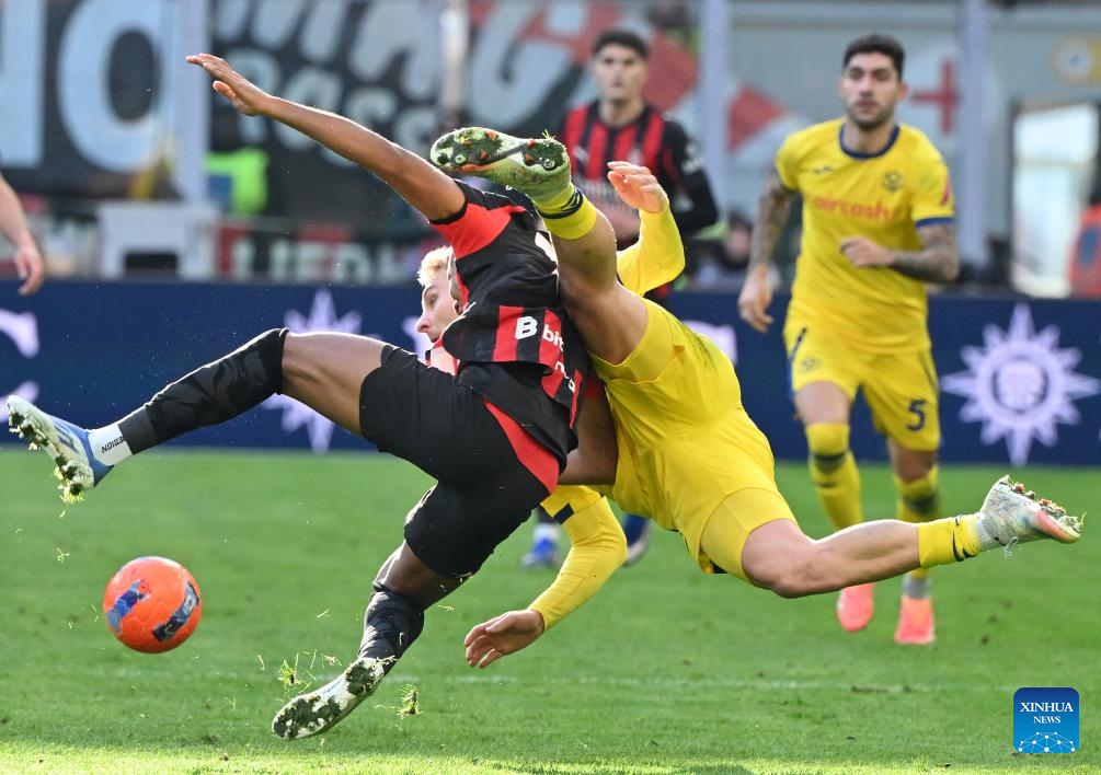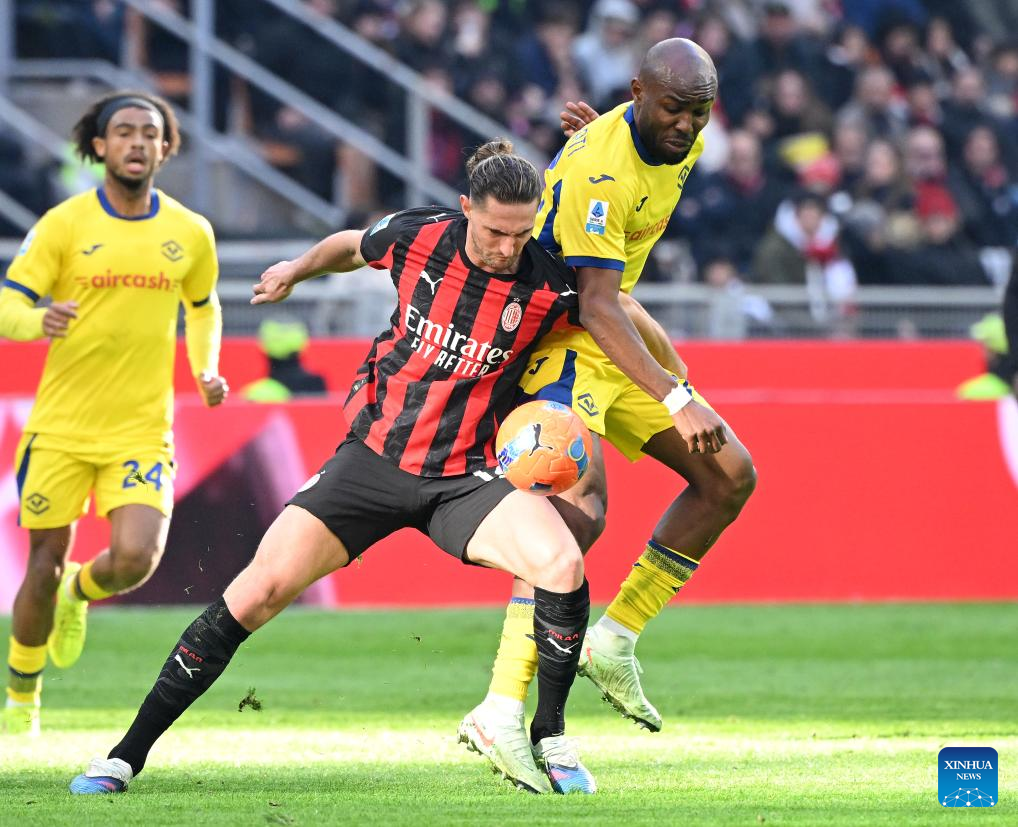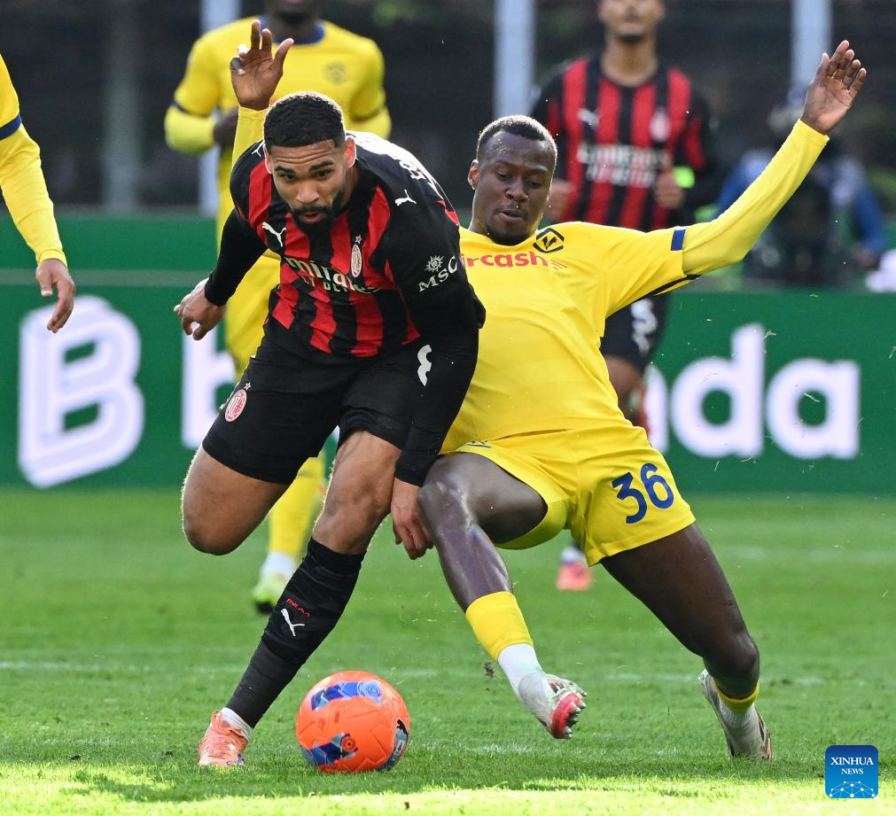 AC Milan's Christopher Nkunku (L) vies with Hellas Verona's Victor Nelsson during a Serie A football match between AC Milan and Hellas Verona in Milan, Italy, Dec. 28, 2025. (Photo by Alberto Lingria/Xinhua)