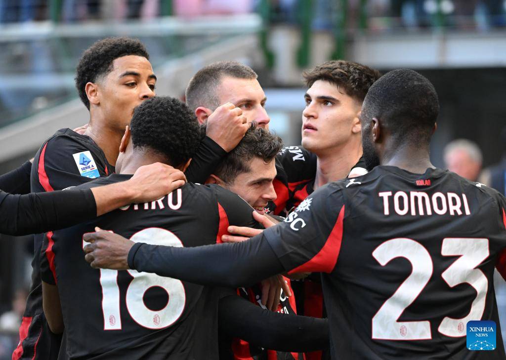 AC Milan's Christian Pulisic (C) celebrates his goal with teammates during a Serie A football match between AC Milan and Hellas Verona in Milan, Italy, Dec. 28, 2025. (Photo by Alberto Lingria/Xinhua)
