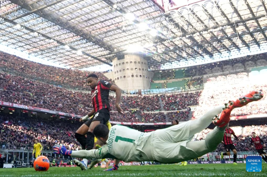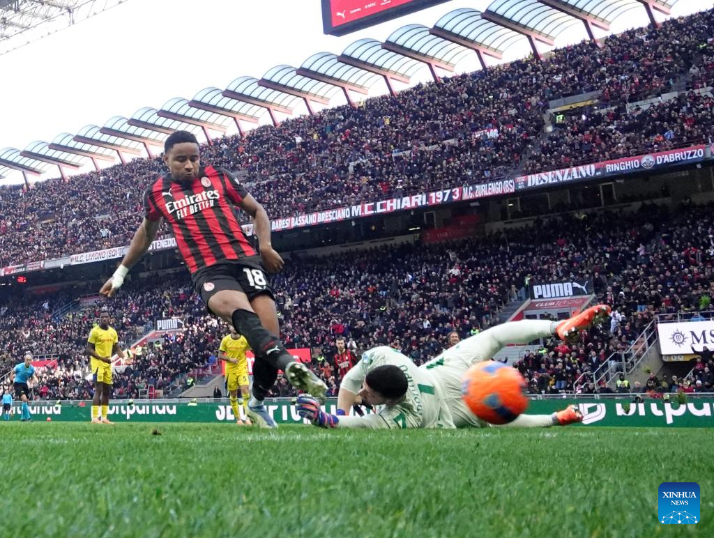 AC Milan's Christopher Nkunku (L) scores his second goal during a Serie A football match between AC Milan and Hellas Verona in Milan, Italy, Dec. 28, 2025. (Photo by Alberto Lingria/Xinhua)