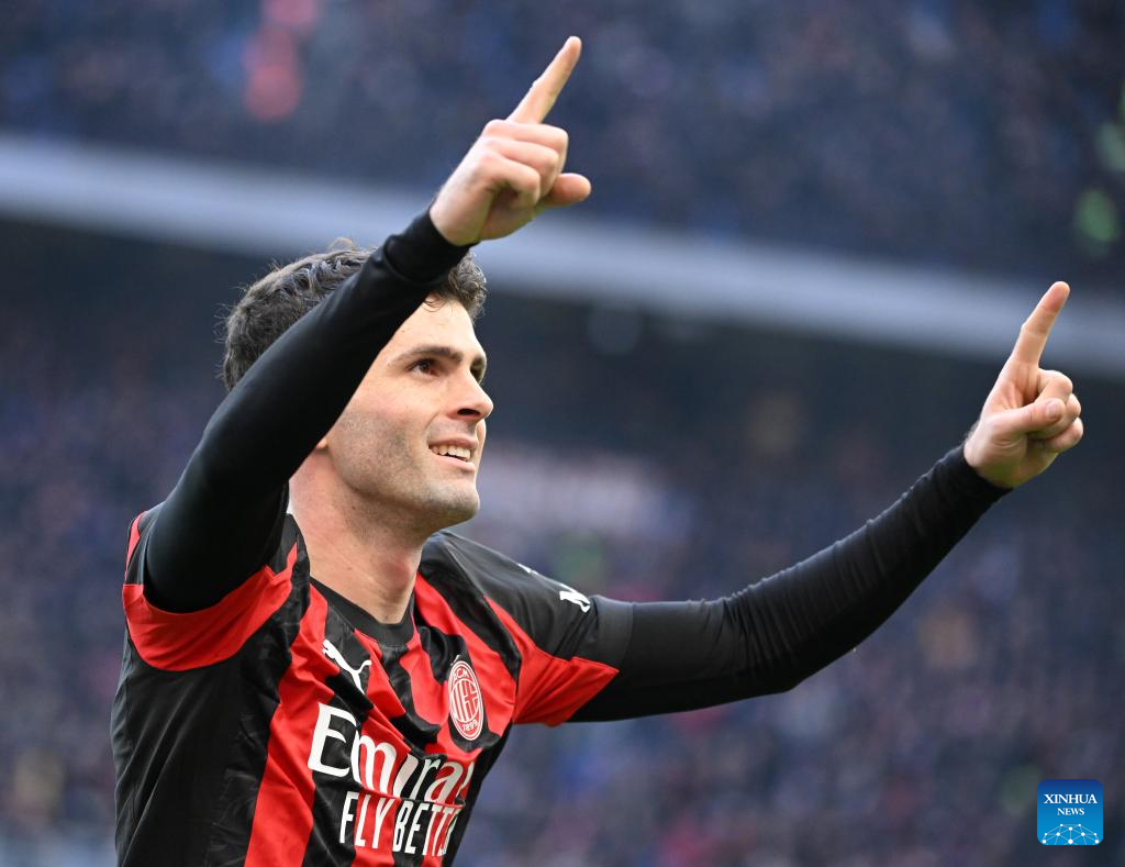AC Milan's Christian Pulisic celebrates his goal during a Serie A football match between AC Milan and Hellas Verona in Milan, Italy, Dec. 28, 2025. (Photo by Alberto Lingria/Xinhua)