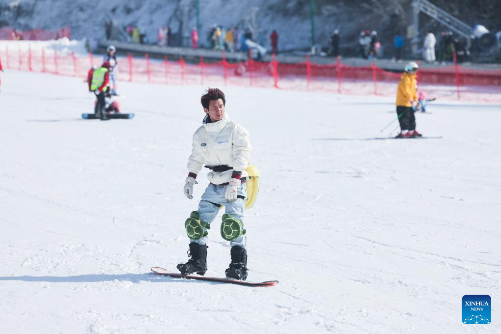Tourists have fun at the SkyLand ski resort in Anji County of Huzhou City, east China's Zhejiang Province on Dec. 28, 2025. Skiing and a variety of other winter sports have become a popular seasonal pastime for a growing number of people in Zhejiang Province. The province boasts many ice and snow resorts, both indoor and outdoor, providing ample choices for enthusiasts. Notable examples include the Wansongling Ski Resort in Hangzhou, Qiaobo Ice and Snow World in Shaoxing, Taihu Lake Longemont Paradise in Huzhou, SkyLand ski resort in Anji, and Pan'an ski Resort in Jinhua. Moreover, such facilities are increasingly taking root across the province.