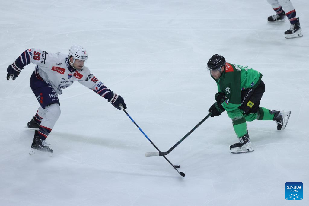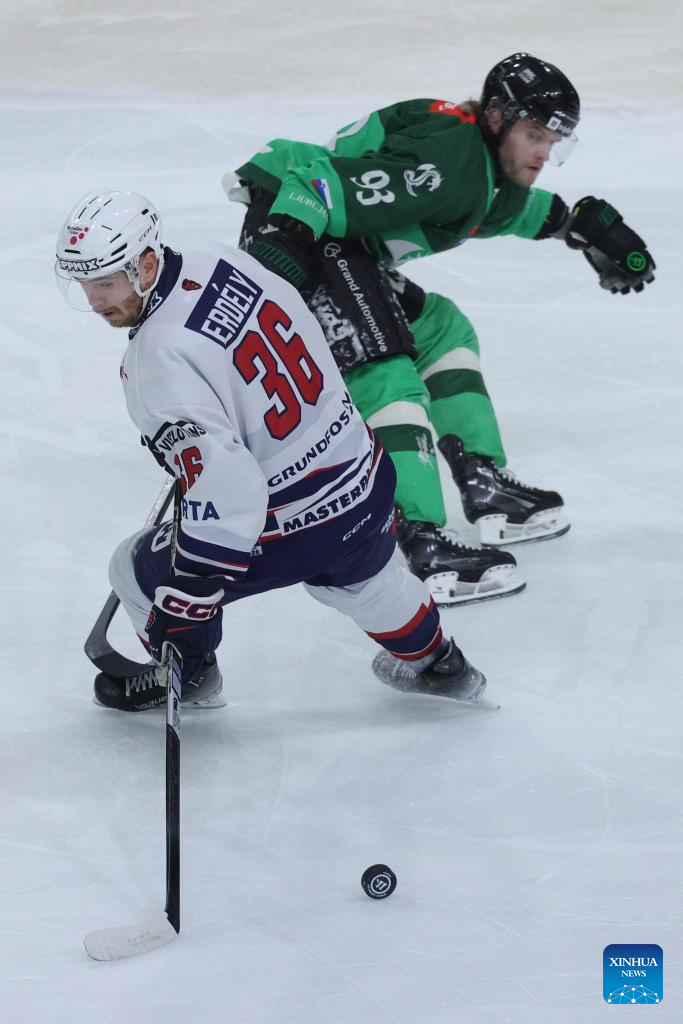 Csanad Erdely (L) of Hydro Fehervar AV 19 battles for the puck against Nicolai Meyer (R) of Olimpija Ljubljana during the 2025/26 Win2day Ice Hockey League match between Olimpija LJubljana and Hydro Fehervar AV 19 in Ljubljana, Slovenia, Dec. 28, 2025. (Photo by Zeljko Stevanic/Xinhua)