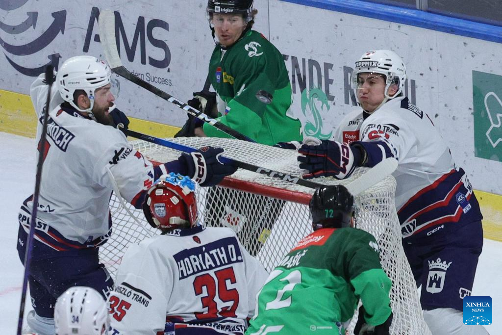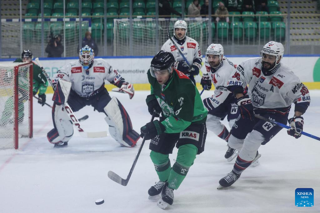 Marcel Mahkovec (front) of Olimpija Ljubljana competes during the 2025/26 Win2day Ice Hockey League match between Olimpija LJubljana and Hydro Fehervar AV 19 in Ljubljana, Slovenia, Dec. 28, 2025. (Photo by Zeljko Stevanic/Xinhua)