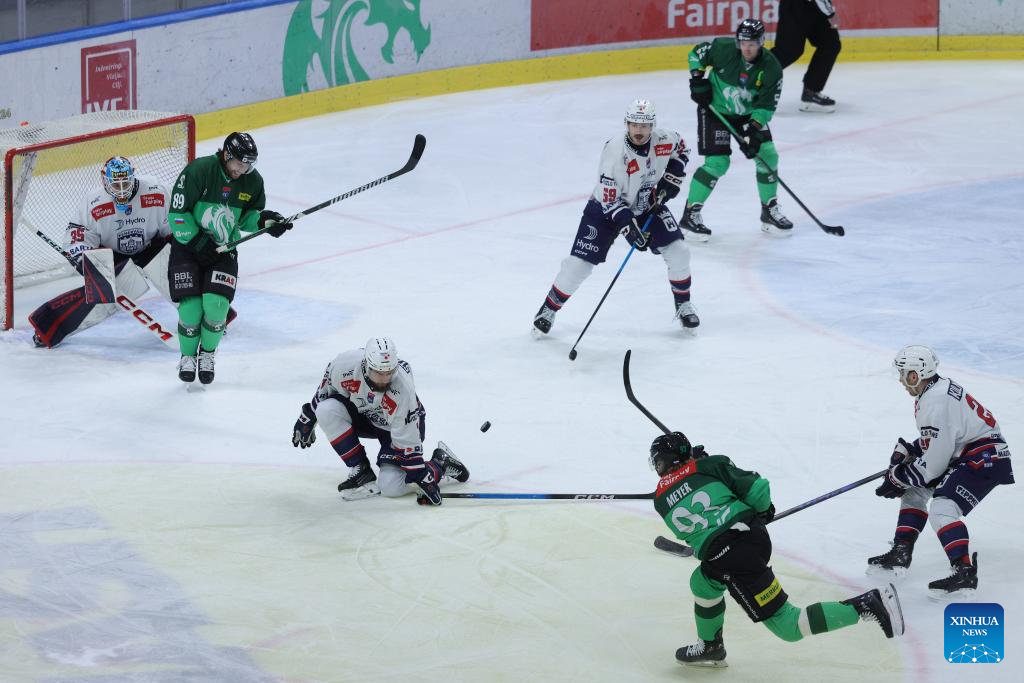 Marcel Mahkovec (C) of Olimpija Ljubljana shoots to score during the 2025/26 Win2day Ice Hockey League match between Olimpija LJubljana and Hydro Fehervar AV 19 in Ljubljana, Slovenia, Dec. 28, 2025. (Photo by Zeljko Stevanic/Xinhua)