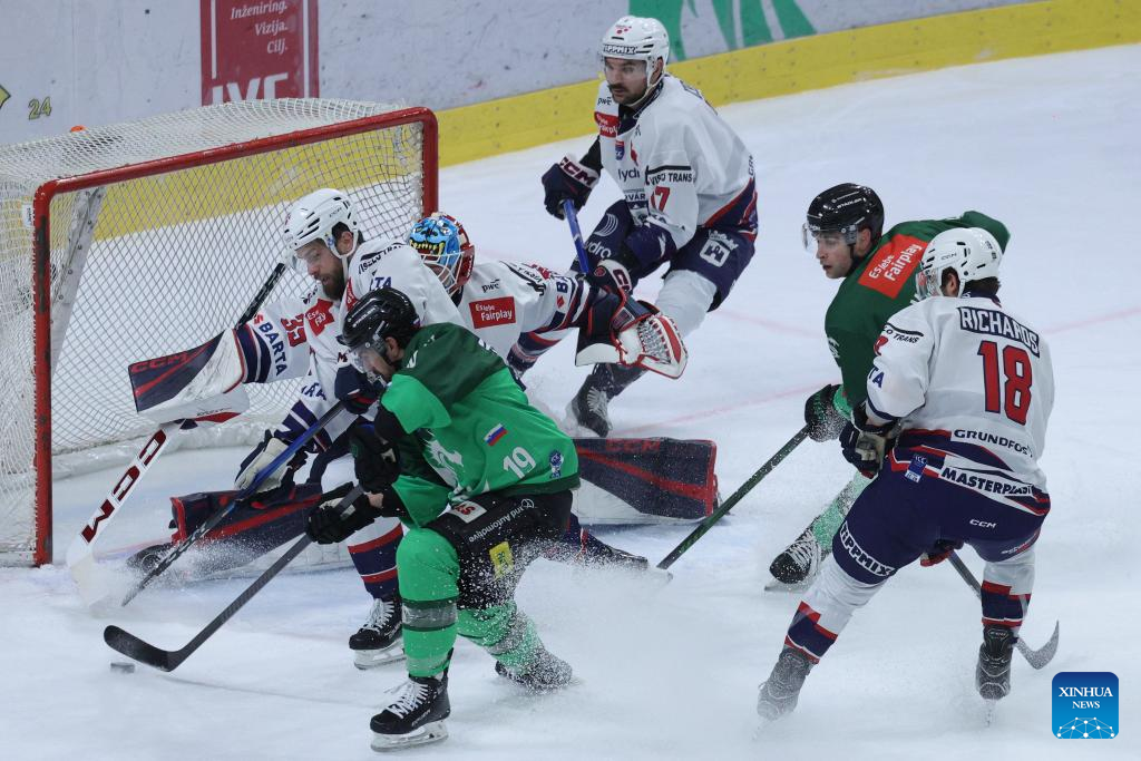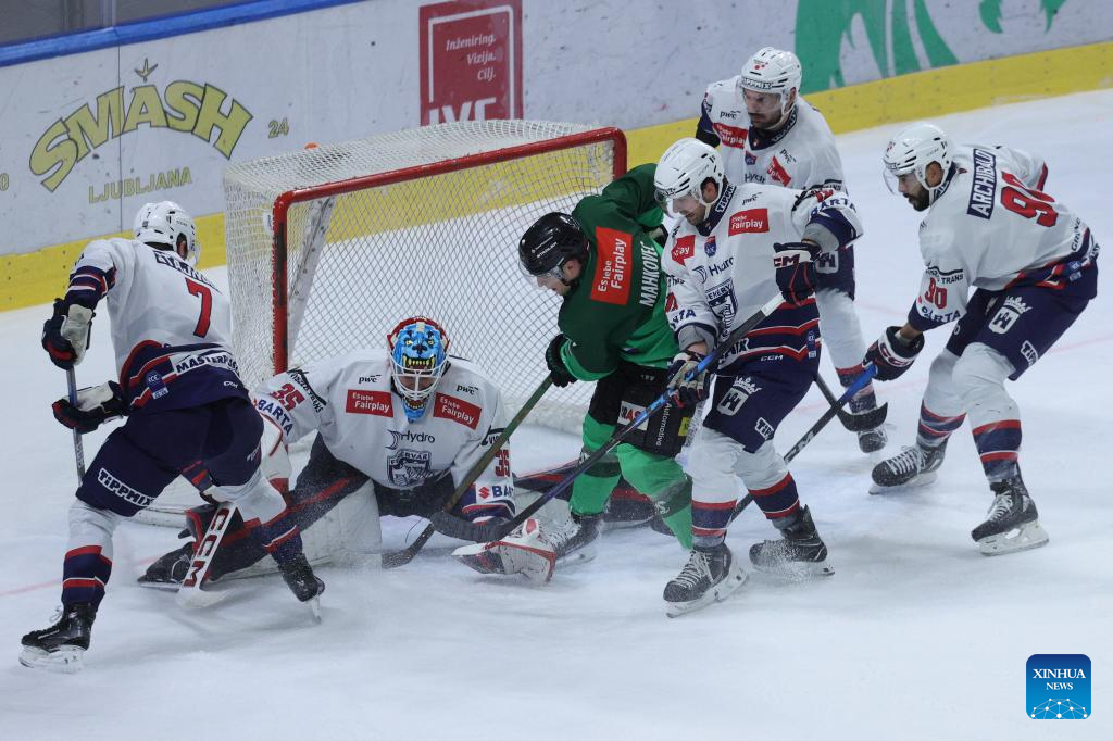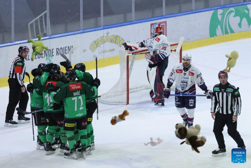 Players of Olimpija Ljubljana celebrate scoring during the 2025/26 Win2day Ice Hockey League match between Olimpija LJubljana and Hydro Fehervar AV 19 in Ljubljana, Slovenia, Dec. 28, 2025. (Photo by Zeljko Stevanic/Xinhua)