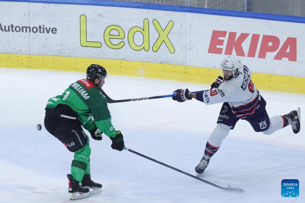Alex Petan (2nd L) of Olimpija Ljubljana vies with Martin Stajnoch (1st L) of Hydro Fehervar AV 19 during the 2025/26 Win2day Ice Hockey League match between Olimpija LJubljana and Hydro Fehervar AV 19 in Ljubljana, Slovenia, Dec. 28, 2025. (Photo by Zeljko Stevanic/Xinhua)