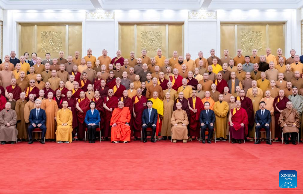 Wang Huning, a member of the Standing Committee of the Political Bureau of the Communist Party of China (CPC) Central Committee and chairman of the Chinese People's Political Consultative Conference (CPPCC) National Committee, meets with delegates attending a national congress of the Buddhist Association of China in Beijing, capital of China. The 11th national congress of the Buddhist Association of China was held from Sunday to Monday in Beijing. (Xinhua/Zhai Jianlan)