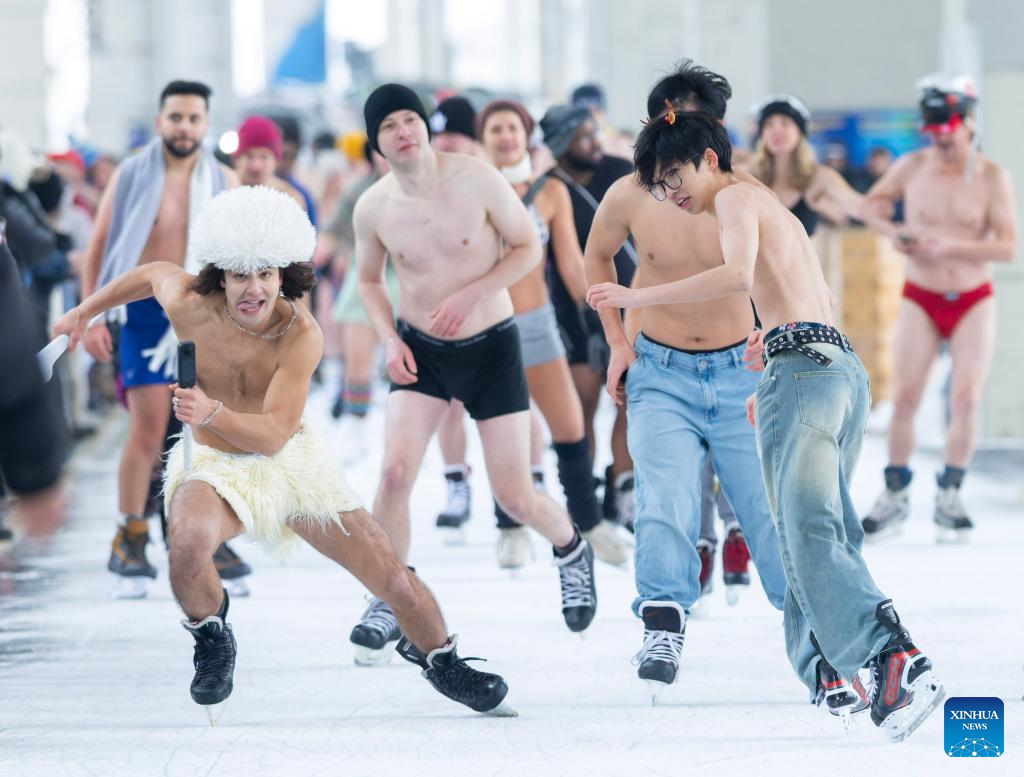 People wearing bathing suits participate in the 2025 Toronto Polar Bear Skate event in Toronto, Canada, on Dec. 28, 2025. About 160 skaters participated in this annual event to bid farewell to 2025 on Sunday. (Photo by Zou Zheng/Xinhua)
