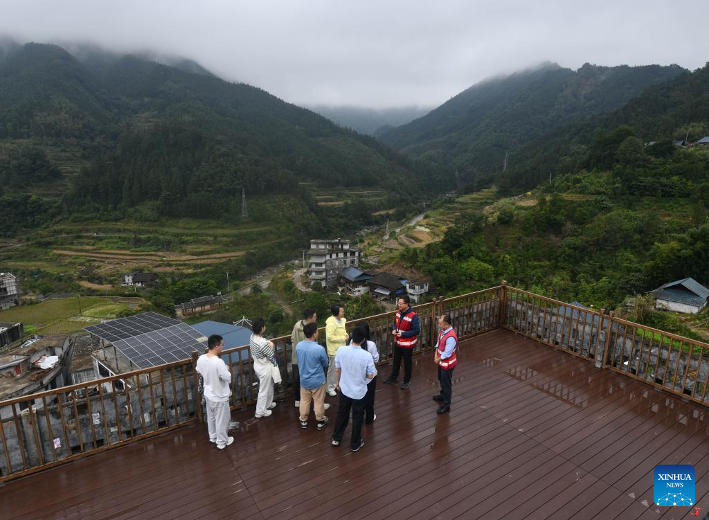 Wang Peng (2nd R), first Party secretary of Zhongping Village, briefs tourists on the village development plan, in Xiangfen Township of Rongshui Miao Autonomous County, south China's Guangxi Zhuang Autonomous Region, Nov. 6, 2025.