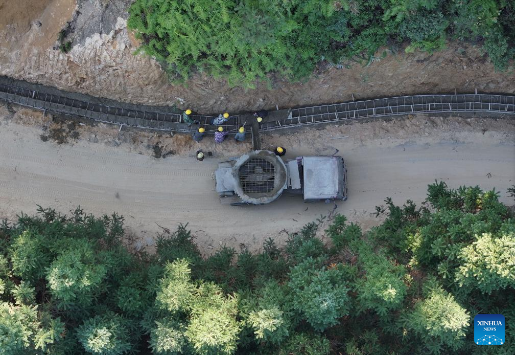 A drone photo shows workers widening a road at Wuying Miao village in Rongshui Miao Autonomous County, south China's Guangxi Zhuang Autonomous Region, Nov. 27, 2025.