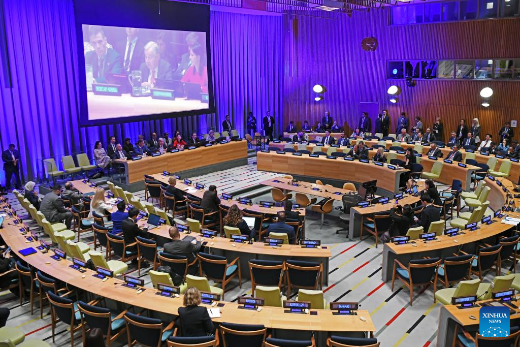 UN Secretary-General Antonio Guterres (C, on screen) speaks at the High-level Multi-Stakeholder Informal Meeting to Launch the Global Dialogue on Artificial Intelligence (AI) Governance, at UN headquarters in New York, on Sept. 25, 2025. The United Nations offers a uniquely universal platform for such global cooperation, and for the first time, every country will have a seat at the table of AI, UN Secretary-General Antonio Guterres said at the meeting. (Xinhua/Li Rui)