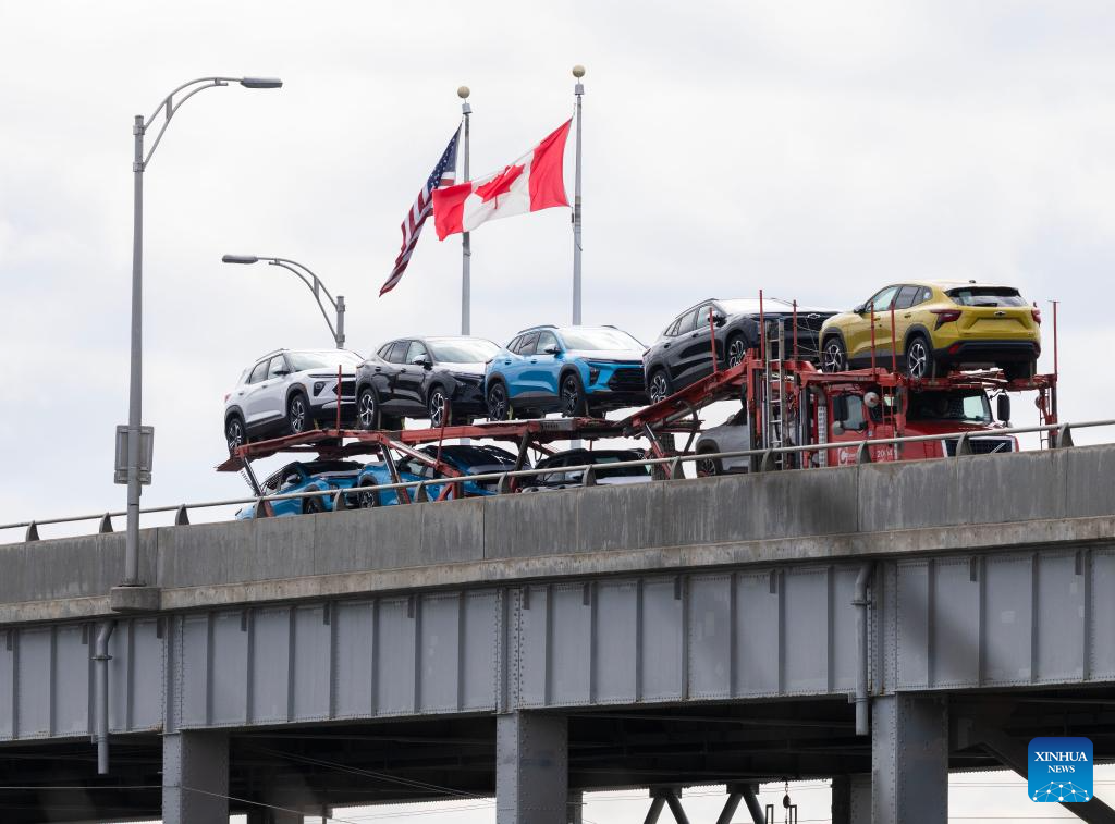 An auto transport carrier crosses the Lewiston-Queenston Bridge on its way to Canada, as seen from the Canadian side in Niagara Falls, Ontario, Canada, on April 9, 2025. Canadian Finance Minister François-Philippe Champagne on April 8 confirmed that Canada's new countermeasures announced in the previous week in response to the U.S. tariffs on the Canadian auto industry would come into force at 12:01 a.m. EDT on April 9. 2. U.S.-initiated tariff war severely impacts multilateral trade system. (Photo by Zou Zheng/Xinhua)