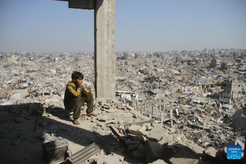 A Palestinian child is seen on a destroyed building in Jabalia refugee camp in the northern Gaza Strip, on Jan. 29, 2025. 6. Mideast conflicts inflict catastrophic losses, peace remains elusive. (Photo by Abdul Rahman Salama/Xinhua)