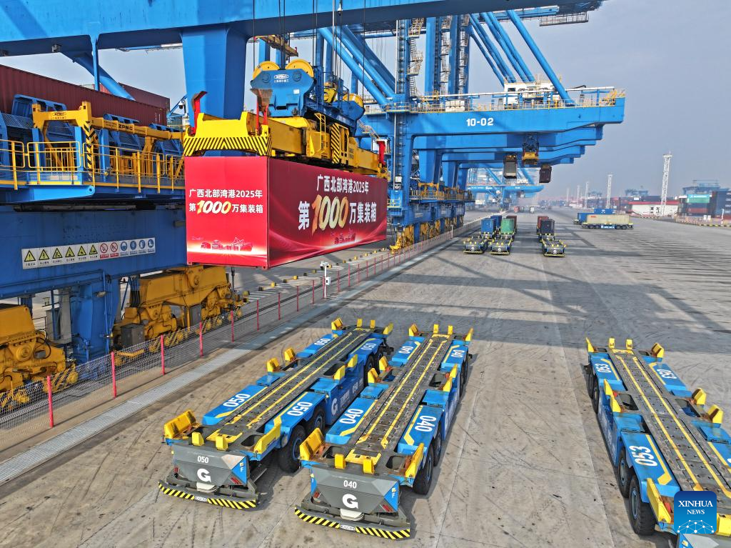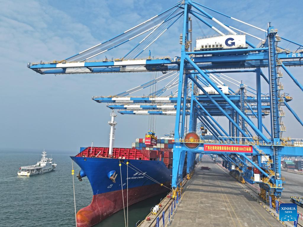 The Beibu Gulf Port's container throughput this year reached 10 million TEUs on Tuesday. (Xinhua/Zhou Hua)