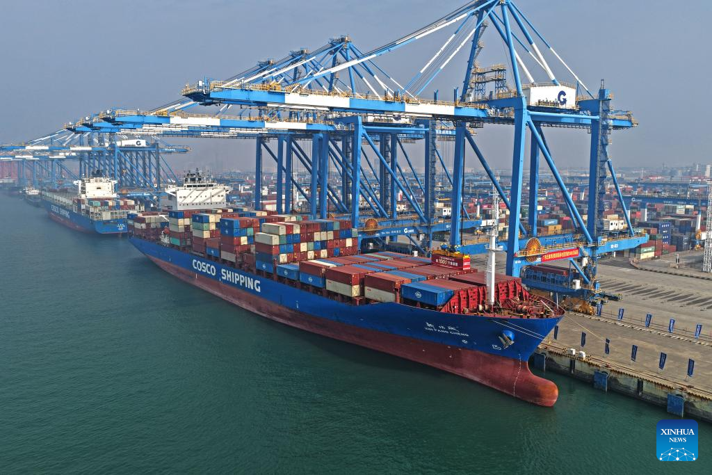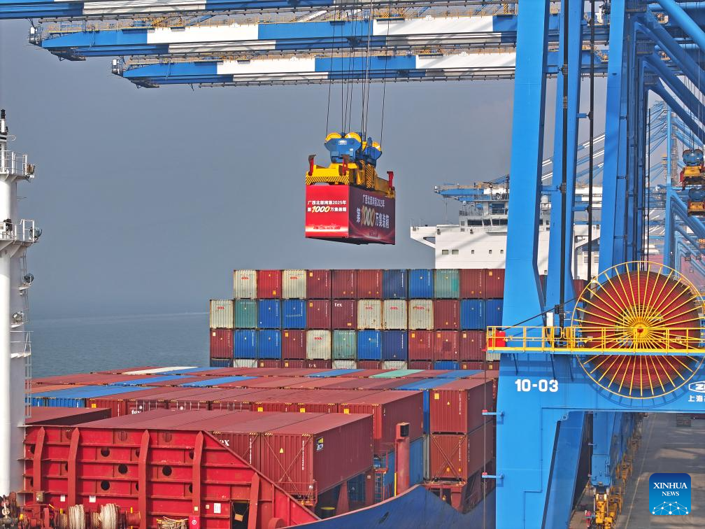 A drone photo taken on Dec. 30, 2025 shows the 10 millionth twenty-foot equivalent unit (TEU) container of this year being hoisted at the Beibu Gulf Port in south China's Guangxi Zhuang Autonomous Region.