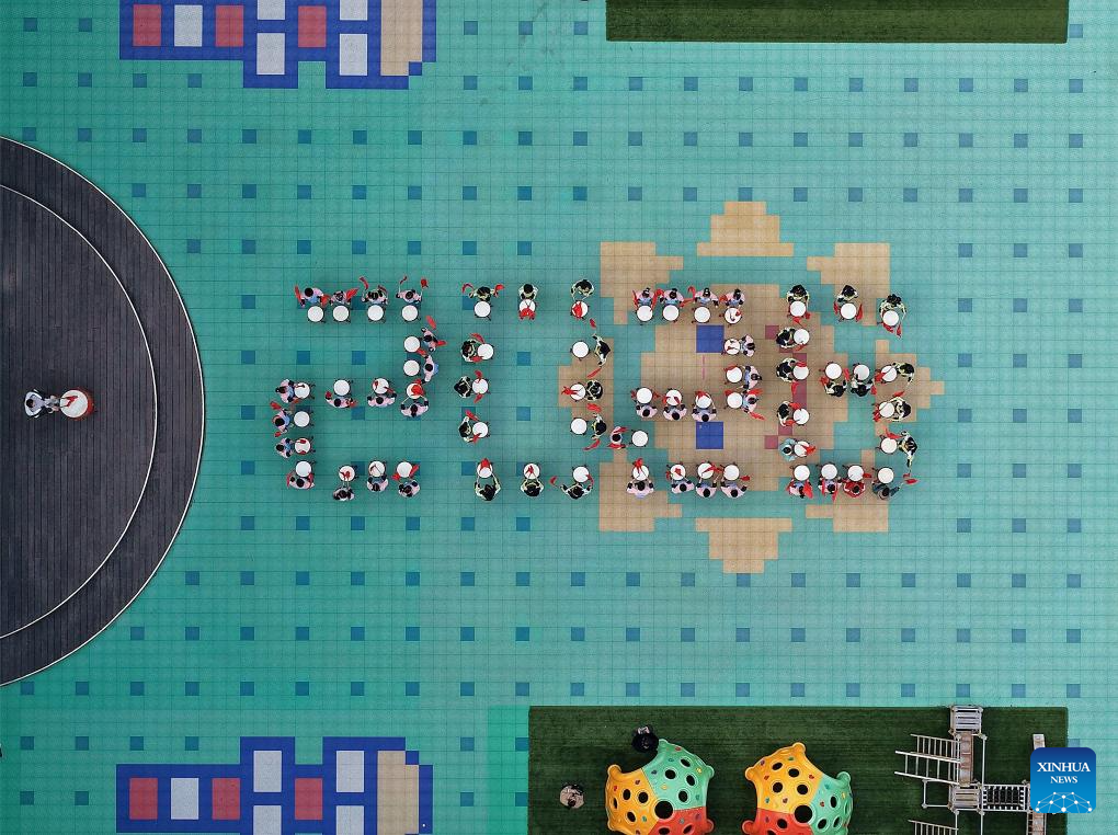 An aerial drone photo taken on Dec. 31, 2025 shows students posing for a group photo at a primary school in Huai'an, east China's Jiangsu Province. Various activities were held across China to celebrate the upcoming new year. (Photo by Zhao Qirui/Xinhua)