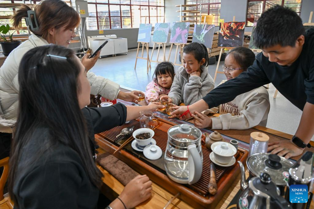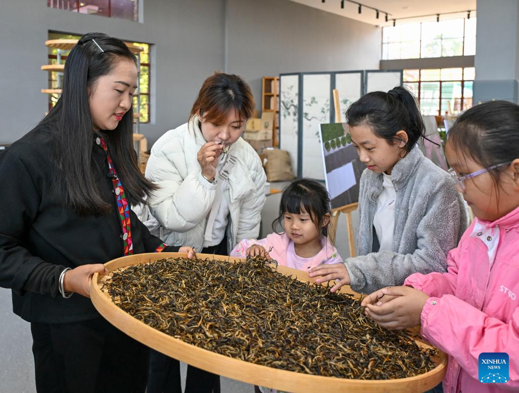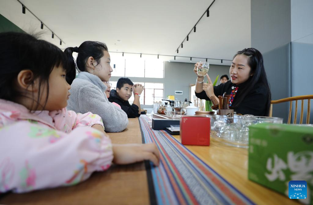 Wei Chun (1st L) introduces the procedure of tea making to students on their study tour at a studio in Dadugang Township of Jinghong City, Xishuangbanna Dai Autonomous Prefecture, southwest China's Yunnan Province, Dec. 21, 2025. Wei Chun used to work at an international hotel in a first-tier city. In June 2024, she became an agricultural manager of a collective economy company in Dadugang Township, a role locals refer to as the "Village CEO."