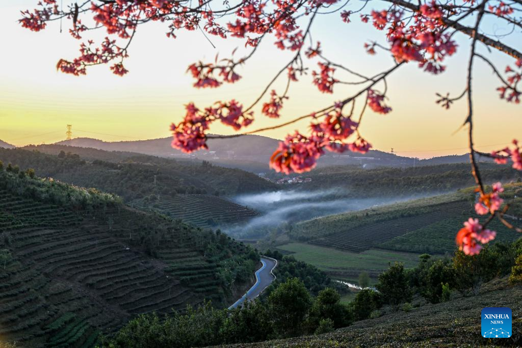 This photo shows winter cherry blossoms and a tea plantation in Dadugang Township of Jinghong City, Xishuangbanna Dai Autonomous Prefecture, southwest China's Yunnan Province, Dec. 21, 2025. Wei Chun used to work at an international hotel in a first-tier city. In June 2024, she became an agricultural manager of a collective economy company in Dadugang Township, a role locals refer to as the "Village CEO."
