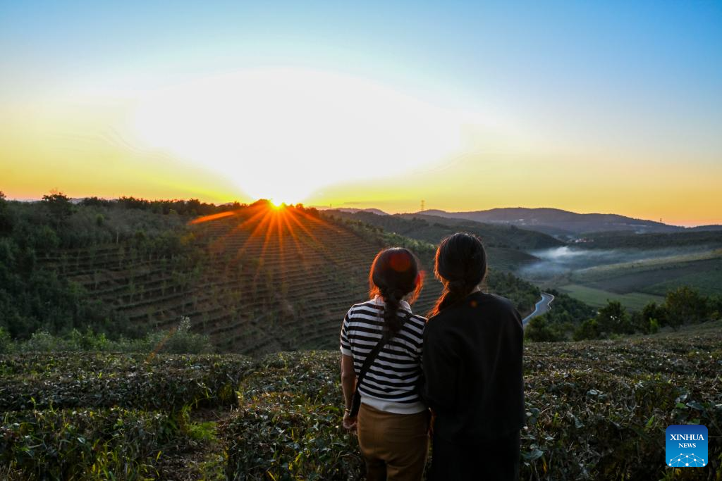 Wei Chun (R) and her mother enjoy the sunset scenery at a tea plantation in Dadugang Township of Jinghong City, Xishuangbanna Dai Autonomous Prefecture, southwest China's Yunnan Province, Dec. 21, 2025. Wei Chun used to work at an international hotel in a first-tier city. In June 2024, she became an agricultural manager of a collective economy company in Dadugang Township, a role locals refer to as the "Village CEO."