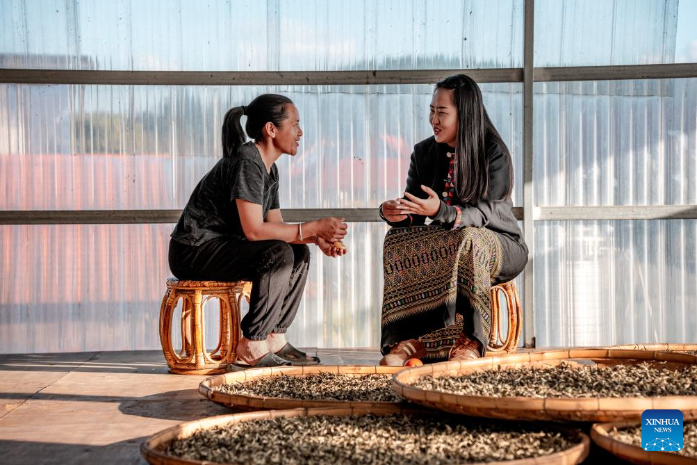 Wei Chun (front, L) tastes tea with students on their study tour at a studio in Dadugang Township of Jinghong City, Xishuangbanna Dai Autonomous Prefecture, southwest China's Yunnan Province, Dec. 21, 2025. Wei Chun used to work at an international hotel in a first-tier city. In June 2024, she became an agricultural manager of a collective economy company in Dadugang Township, a role locals refer to as the "Village CEO."