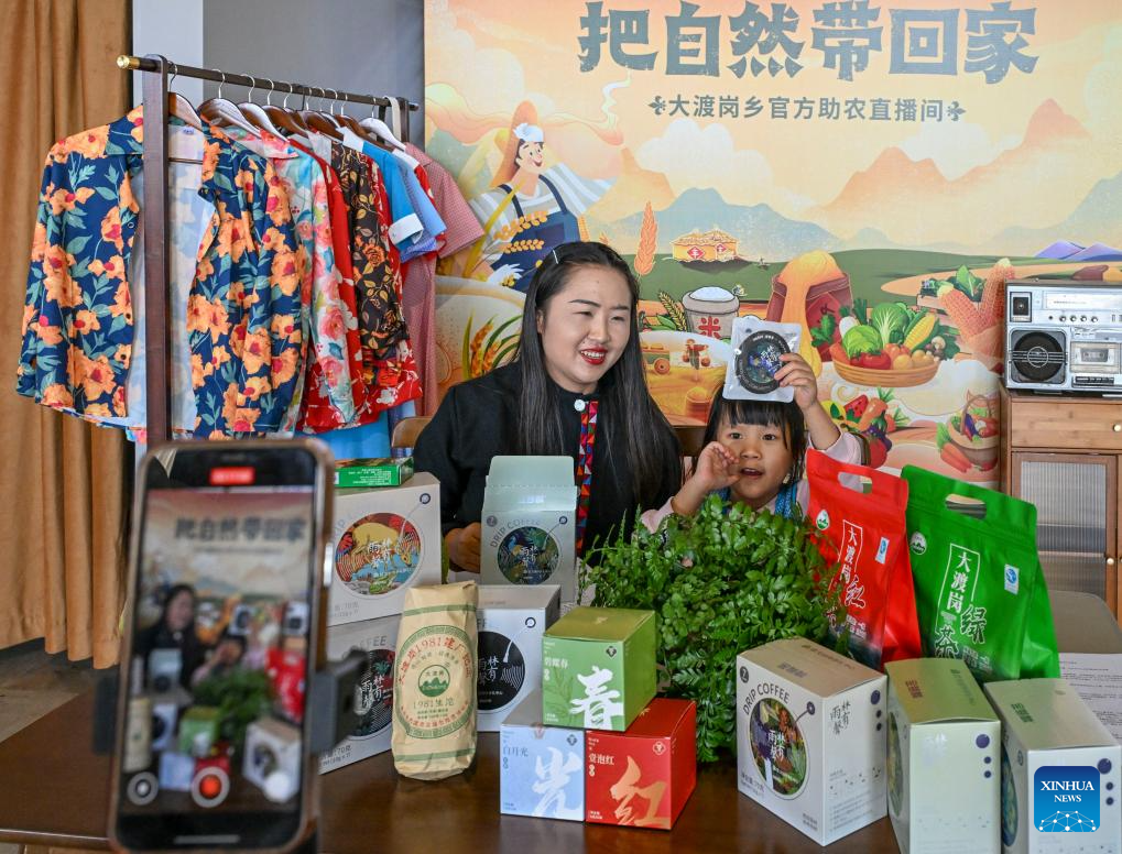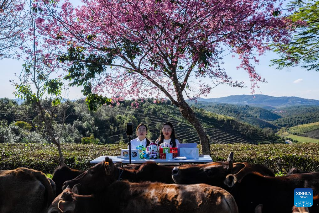 Wei Chun (R) promotes local specialty products via livestreaming in Dadugang Township of Jinghong City, Xishuangbanna Dai Autonomous Prefecture, southwest China's Yunnan Province, Dec. 22, 2025. Wei Chun used to work at an international hotel in a first-tier city. In June 2024, she became an agricultural manager of a collective economy company in Dadugang Township, a role locals refer to as the "Village CEO."