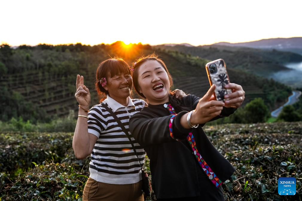Wei Chun (R) and her mother take a selfie at a tea plantation in Dadugang Township of Jinghong City, Xishuangbanna Dai Autonomous Prefecture, southwest China's Yunnan Province, Dec. 21, 2025. Wei Chun used to work at an international hotel in a first-tier city. In June 2024, she became an agricultural manager of a collective economy company in Dadugang Township, a role locals refer to as the "Village CEO."