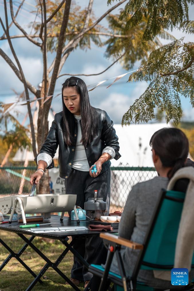 Wei Chun (L) prepares barbecue tools for tourists at a campsite in Dadugang Township of Jinghong City, Xishuangbanna Dai Autonomous Prefecture, southwest China's Yunnan Province, Dec. 20, 2025. Wei Chun used to work at an international hotel in a first-tier city. In June 2024, she became an agricultural manager of a collective economy company in Dadugang Township, a role locals refer to as the "Village CEO."
