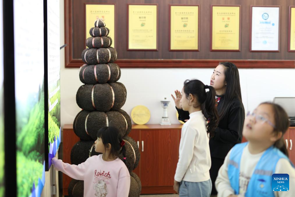 Wei Chun introduces the tea industry to students on their study tour in Dadugang Township of Jinghong City, Xishuangbanna Dai Autonomous Prefecture, southwest China's Yunnan Province, Dec. 21, 2025. Wei Chun used to work at an international hotel in a first-tier city. In June 2024, she became an agricultural manager of a collective economy company in Dadugang Township, a role locals refer to as the "Village CEO."