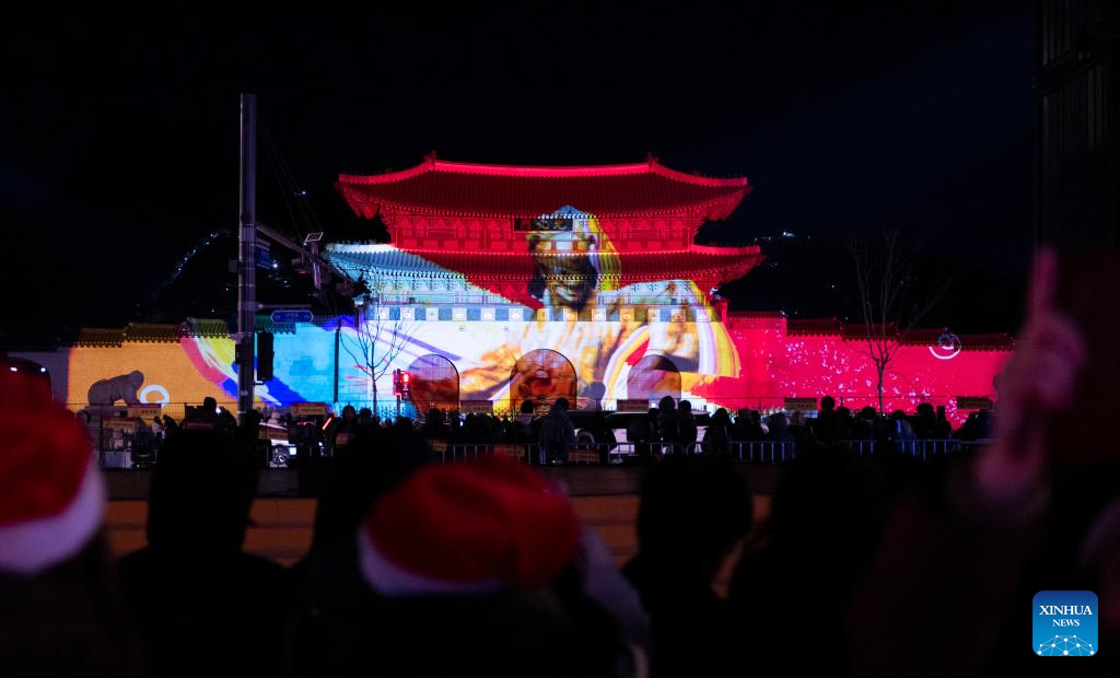 People enjoy a New Year light show in Seoul, South Korea on Dec. 31, 2025. (Photo by Jun Hyosang/Xinhua)