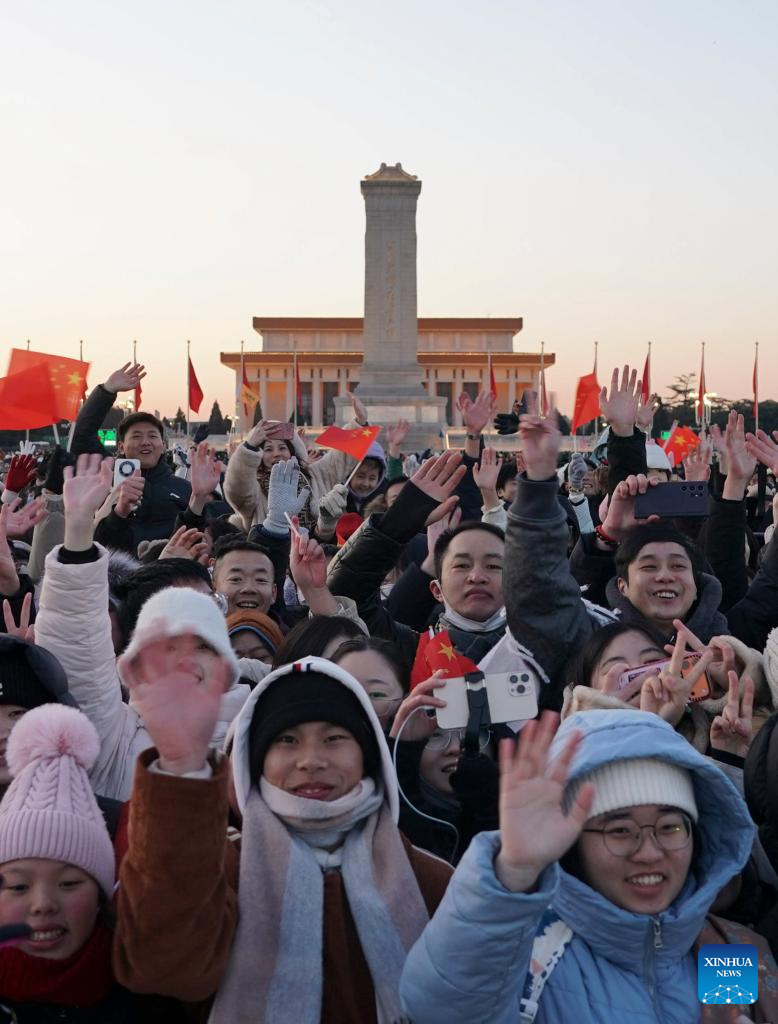 People cheer after watching a grand national flag-raising ceremony at Tian'anmen Square in Beijing, capital of China, Jan. 1, 2026. (Xinhua/Xie Han)