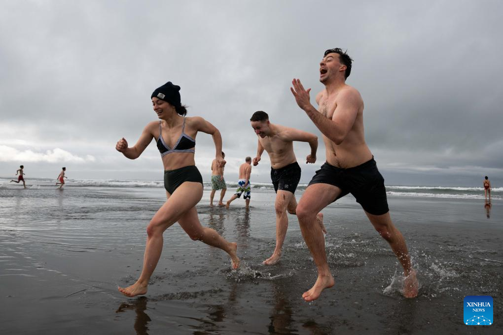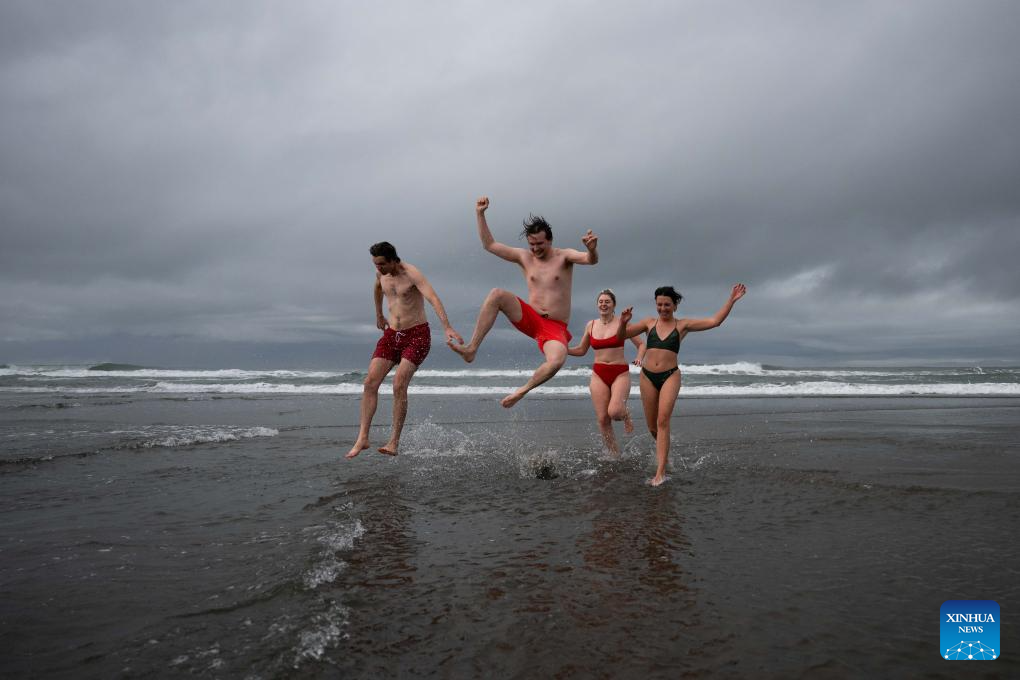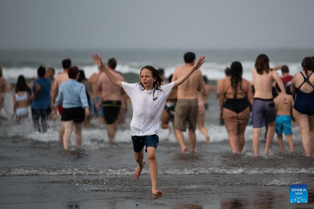 People play in the water to celebrate the New Year in San Francisco, California, the United States, Jan. 1, 2026. (Photo by Ziyu Julian Zhu/Xinhua)