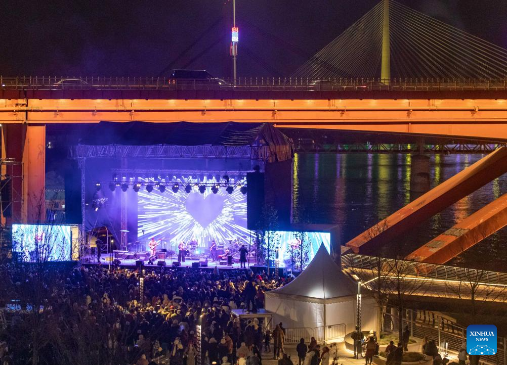 People watch a New Year's performance by the Sava River in Belgrade, Serbia, Jan. 1, 2026. (Photo by Wang Wei/Xinhua)