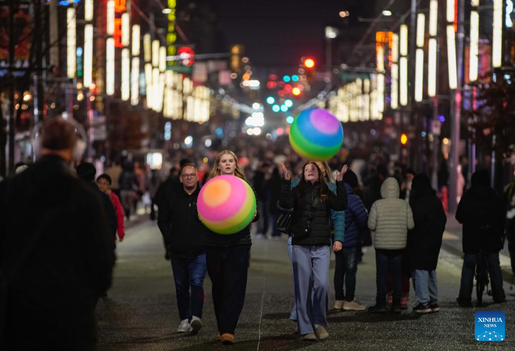 People walk along a street during the New Year's Eve in downtown Vancouver, British Columbia, Canada, Dec. 31, 2025. (Photo by Liang Sen/Xinhua)