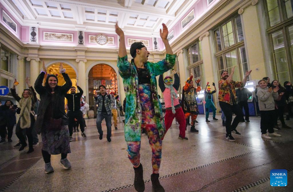 People take part in a flash mob-style dance party inside a subway station to celebrate the New Year in downtown Vancouver, British Columbia, Canada, Dec. 31, 2025. (Photo by Liang Sen/Xinhua)
