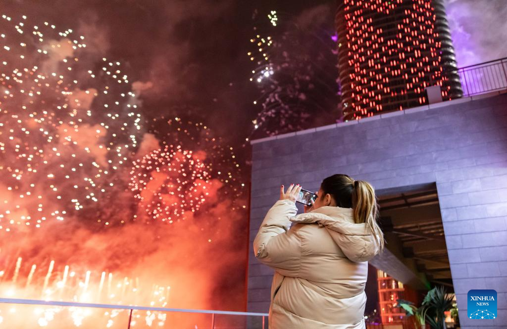 This photo shows a scene during the 2026 New Year's Day celebrations in Lusail, Qatar, Jan. 1, 2026. (Photo by Nikku/Xinhua)