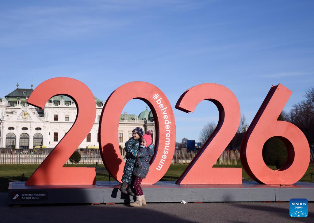 Children pose with a New Year's art installation near the Belvedere Garden in Vienna, Austria, Jan. 1, 2026. (Xinhua/He Canling)