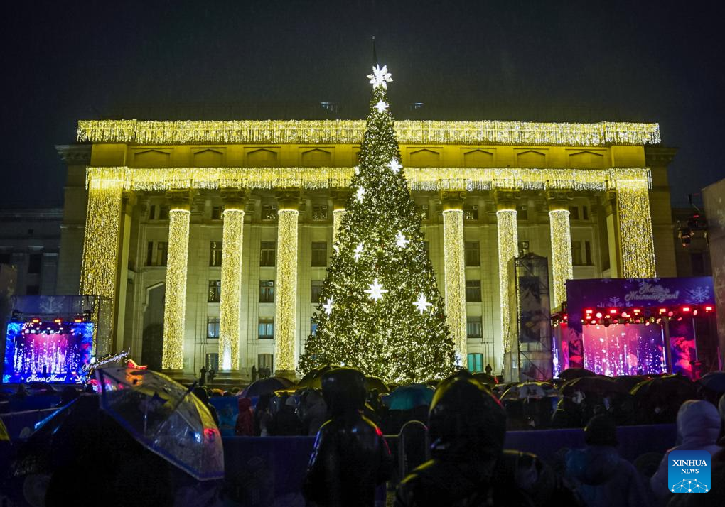 People walk through New Year decorations in Almaty, Kazakhstan, on Dec. 31, 2025. (Xinhua/Li Renzi)