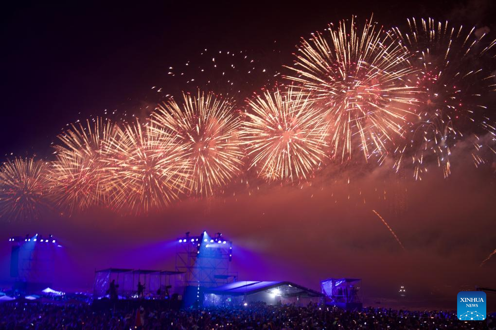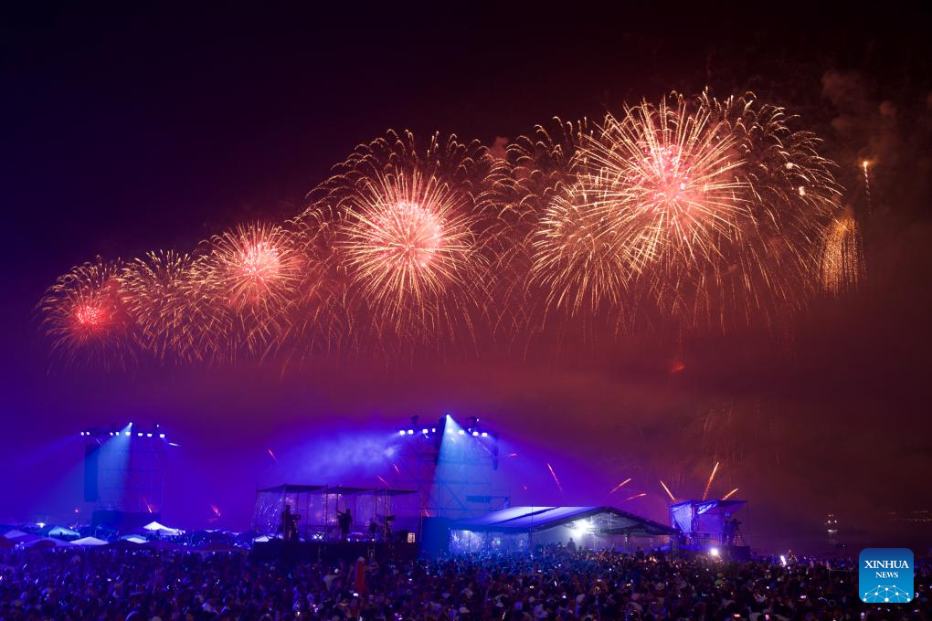 Fireworks light up the sky during a New Year's Eve fireworks display at Copacabana Beach in Rio de Janeiro, Brazil, Jan. 1, 2026. (Xinhua/Zhou Yongsui)