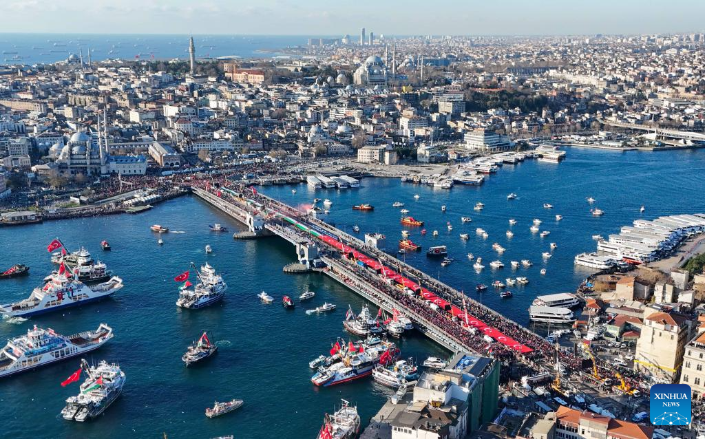 An aerial drone photo taken on Jan. 1, 2026 shows people gathering on the Galata Bridge to show solidarity with Palestine in Istanbul, Türkiye. More than half a million people rallied in Türkiye's largest city Istanbul on New Year's Day to show solidarity with Gaza. (Xinhua/Liu Lei)